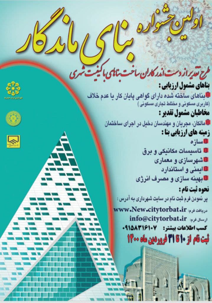 اولین جشنواره بنای ماندگار شهر تربت حیدریه برگزار خواهد شد این جشنواره در راستای تقدیر از دست اندرکاران ساخت بناهای با کیفت شهری برگزار می شود .مالکان مجریان و مهندسان دخیل در اجرای ساختمان در زمینه های سازه تاسیسات ، شهرسازی معماری ایمنی و استاندارد و بهینه سازی مصرف انرژی می تواند در این جشنواره […]